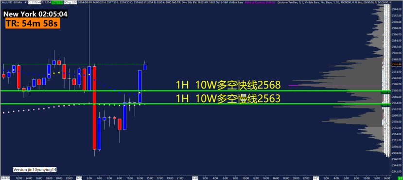 1小时10W多空指标快线2568,慢线支撑2563。10W多空指标主要用作趋势判断,运用快慢线颜色来判断趋势。4小时震荡偏多,1小时震荡,短线按照格局观察。