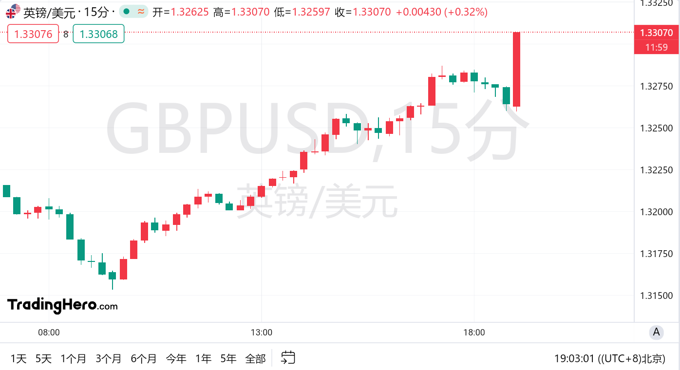在利率决定公布后,英镑兑美元短线走高30点,最高至1.3313,涨至自2022年3月以来的最高水平。