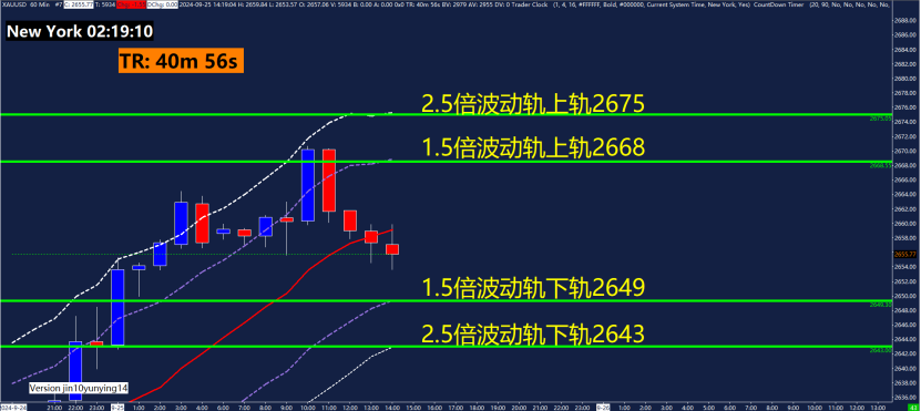 1小时黄金波动轨指标关键点位2643、2649、2668、2675。黄金波动轨主要用在震荡行情,运用波动轨中轨(红色线)判断是趋势还是震荡行情,中轨接近水平,先看做震荡行情。