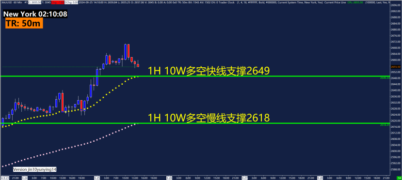 1小时10W多空指标快线2649,慢线支撑2618。10W多空指标主要用作趋势判断,运用快慢线颜色来判断趋势。4小时偏多,1小时偏多,短线按照震荡偏多格局观察。