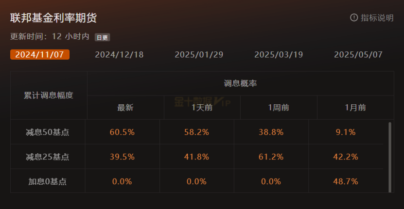 实际利率的下降为黄金提供了上涨动力,预计在降息周期中将推动黄金中长期上涨。FEDWATCH显示,美联储11月降息50个基点的预期为60.5%,年底利率可能降至4.5%。今晚关注美国初请数据以及GDP数据。
