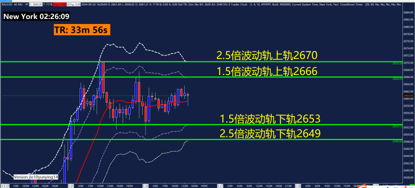 1小时黄金波动轨指标关键点位2649、2653、2666、2670。黄金波动轨主要用在震荡行情,运用波动轨中轨(红色线)判断是趋势还是震荡行情,中轨接近水平,先看做震荡行情。