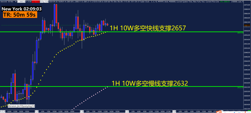 1小时10W多空指标快线2657,慢线支撑2632。10W多空指标主要用作趋势判断,运用快慢线颜色来判断趋势。4小时偏多,1小时震荡,短线按照震荡格局观察。