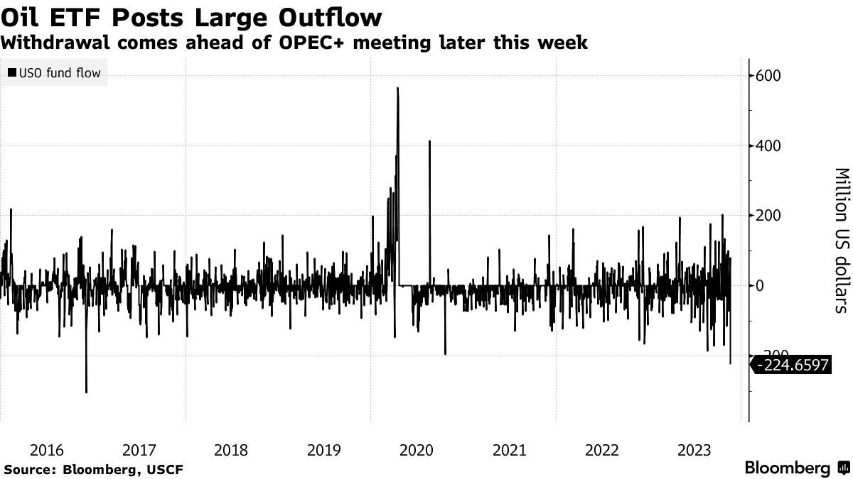 与此同时,数据显示,石油市场最大的交易所交易基金(ETF)之一在欧佩克+关键的产量政策会议召开前几天出现了近七年来最大的单日资金流出,撤资规模达到近2.25亿美元。