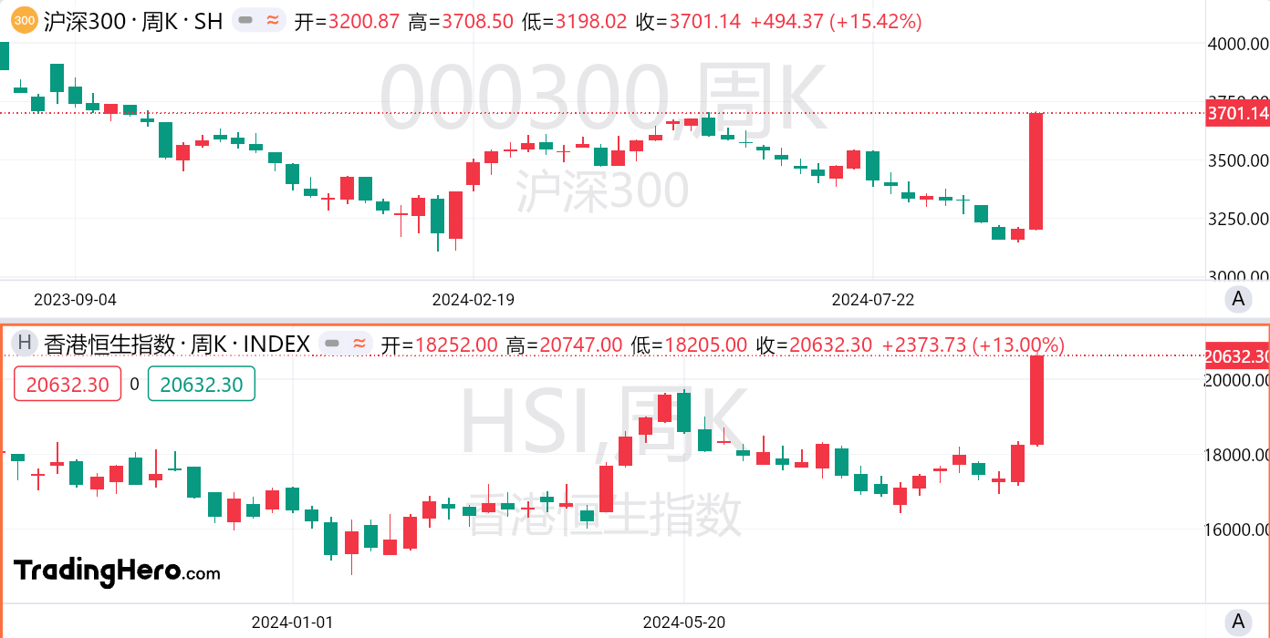 周五,沪深300指数上涨4.47%,而香港恒生指数则上涨3.55%,自本周初以来涨幅超过12%,这是自2007年8月触及历史高点以来的最大单周涨幅。