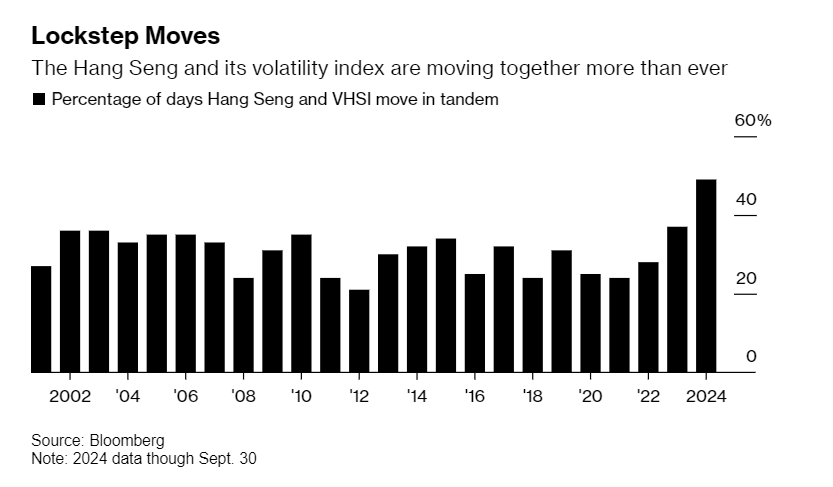 在9月23日恒生指数和恒生指数波动率指数双双下跌后,这两个指数在截至周一的五天内一致攀升,均收于高点。自2022年11月恒生指数触及13年低点后不久,两者已经很长时间没有同步上涨了。