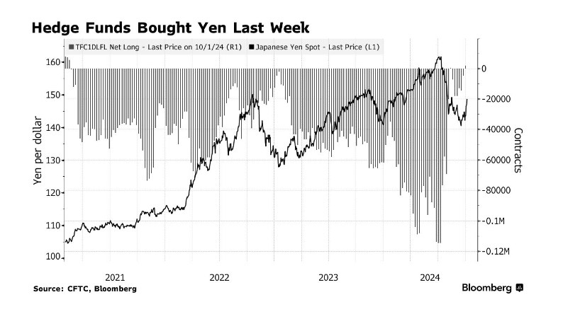 上周,日元兑美元汇率下跌4.4%,创下2009年12月以来的最大跌幅,因为就业数据上行意外和石破茂的评论促使人们重新思考日元的走势。包括一些对冲基金在内的投资者已经在高风险的套利交易中重新做空日元,反映出对日元的看跌情绪。