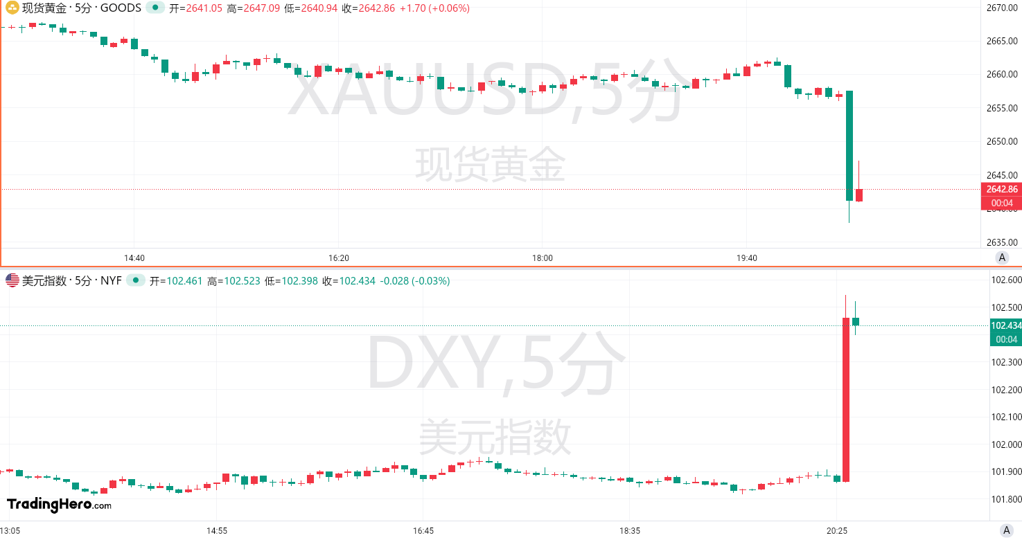 数据公布后,现货黄金短线急坠20美元,美元指数狂飙,并冲上102关口上方。