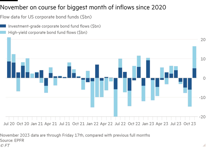 根据资金流动追踪机构EPFR的数据,截至11月20日的一个月内,已有超过160亿美元流入公司债券基金,净流入量已超过2020年7月以来的任何一个完整月。