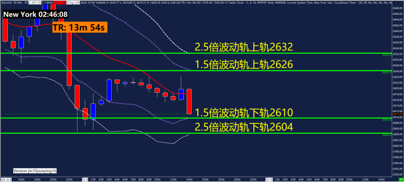 1小时黄金波动轨指标关键点位2604、2610、2626、2632。黄金波动轨主要用在震荡行情,运用波动轨中轨(红色线)判断是趋势还是震荡行情,中轨稍稍朝下,先看做震荡谨慎偏空行情。