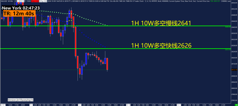 1小时10W多空指标快线压力2626,慢线压力2641。10W多空指标主要用作趋势判断,运用快慢线颜色来判断趋势。4小时震荡偏空,1小时空头格局,短线按照震荡偏空格局观察。在1H级别震荡偏空情况下,关注快线压力2626附近博弈机会。
