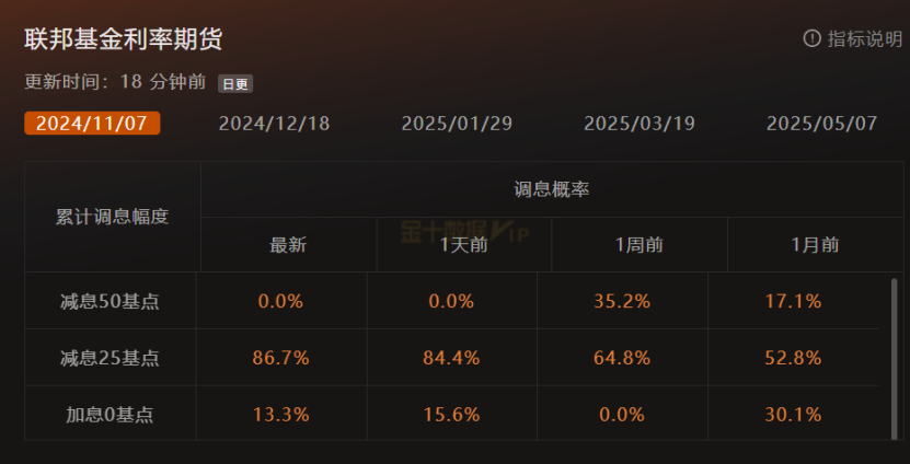 美联储官员陆续发声,打压降息预期。FEDWATCH显示,美联储11月降息25个基点的预期为86.7%,年底利率可能降至4.5%。继续关注美联储官员言论。