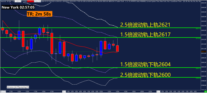 1小时黄金波动轨指标关键点位2600、2604、2617、2621。黄金波动轨主要用在震荡行情,运用波动轨中轨(红色线)判断是趋势还是震荡行情,中轨稍稍朝下,先看做震荡谨慎偏空行情。