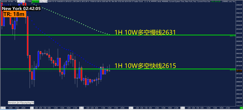 1小时10W多空指标快线压力2615,慢线压力2631。10W多空指标主要用作趋势判断,运用快慢线颜色来判断趋势。4小时震荡偏空,1小时空头格局,短线按照震荡偏空格局观察。在1H级别震荡偏空情况下,关注快线压力2615以及慢线压力2631附近博弈机会。
