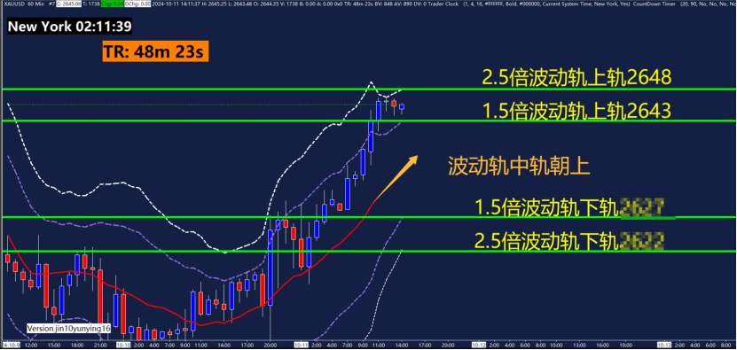 1小时黄金波动轨指标关键点位XXXX 、XXXX、2643、2648。黄金波动轨主要用在震荡行情,运用波动轨中轨(红色线)判断是趋势还是震荡行情,中轨稍稍朝上,先看做震荡偏多行情。