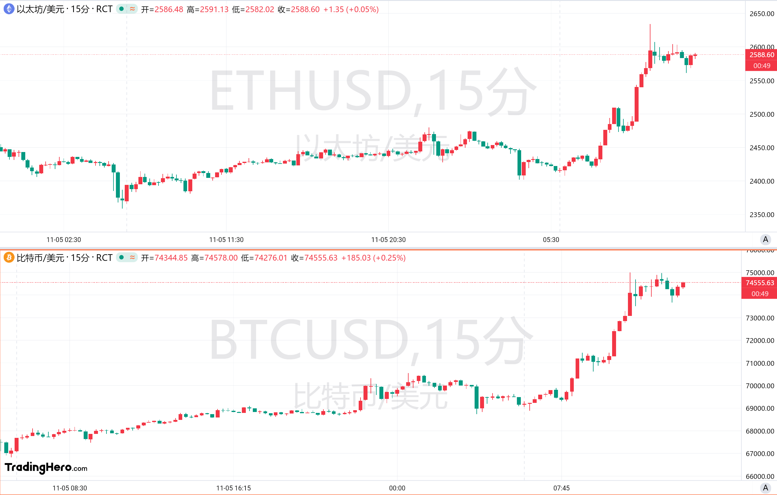 另外,比特币多头加倍押注特朗普,比特币日内大涨超7%,一度接近75000关口,创历史新高。以太坊突破2600美元/枚,日内涨7.32%。分析认为,比特币有望从特朗普胜利中受益,特朗普是加密货币的积极支持者,他称要建立原始加密货币的战略储备,并任命对该行业友好的监管机构。