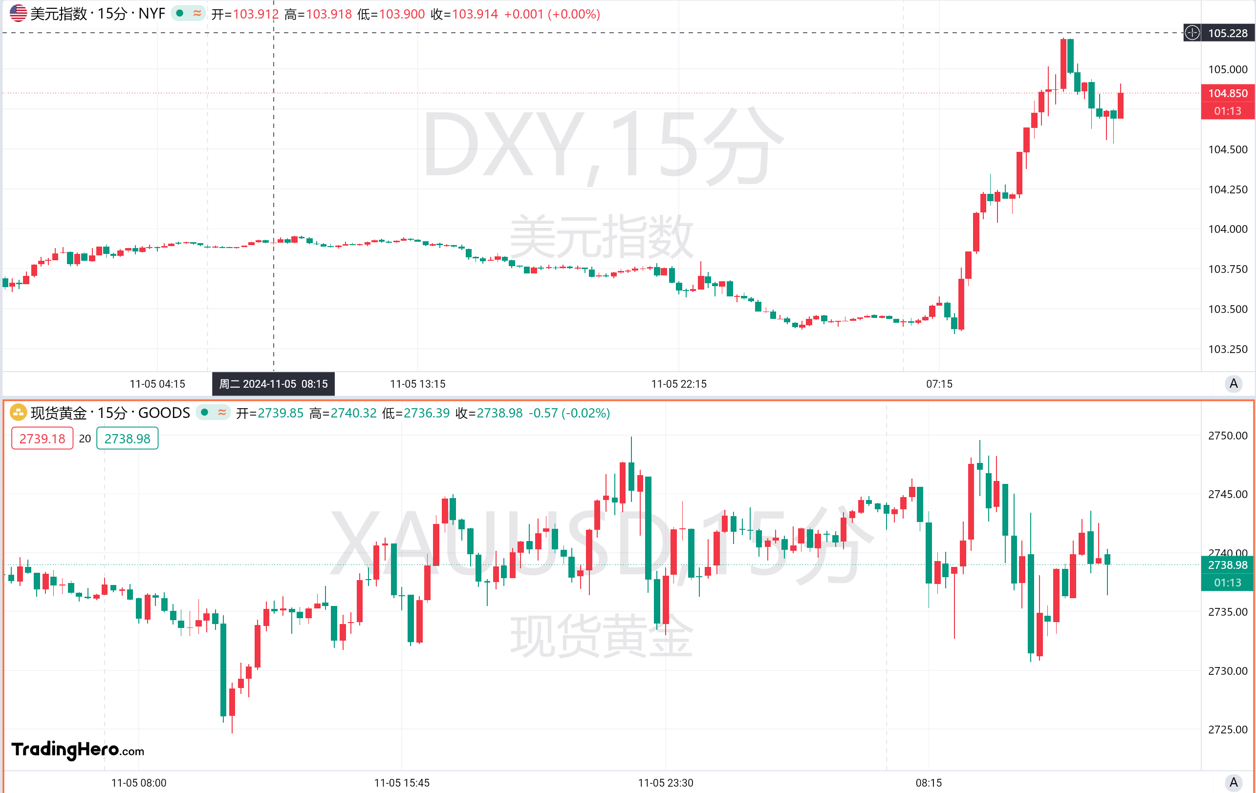 开始公布结果以来,美元指数持续走高,日内涨超1%,一度站上105整数关口,升至7月份以来最高水平;现货黄金走势较为不明朗,此前走低至2730美元/盎司后有所回升,目前再度承压。外汇市场目前可能正在喘息,但期权市场仍在为今天晚些时候的高波动做好准备。例如,美元兑日元的一日隐含波动率(衡量第二天预期走势的指标)仍接近三个月来的最高水平。