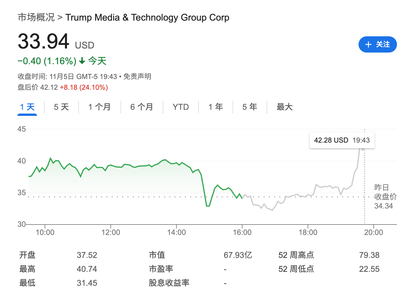 受特朗普暂时领先的消息提振,特朗普媒体科技集团(DJT.O)美股盘后大涨30%。