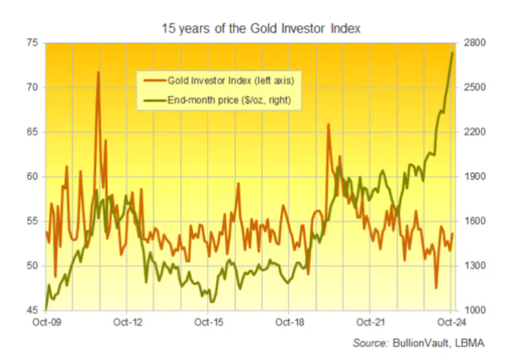 BullionVault的数据显示,在全球范围内,10月贵金属的新投资者数量比之前的12个月平均水平翻了一番——增长了104.2%,环比增长了49.9%,创下自2022年3月以来的最高水平,这主要得益于来自英国、法国、德国和意大利的买家激增。
