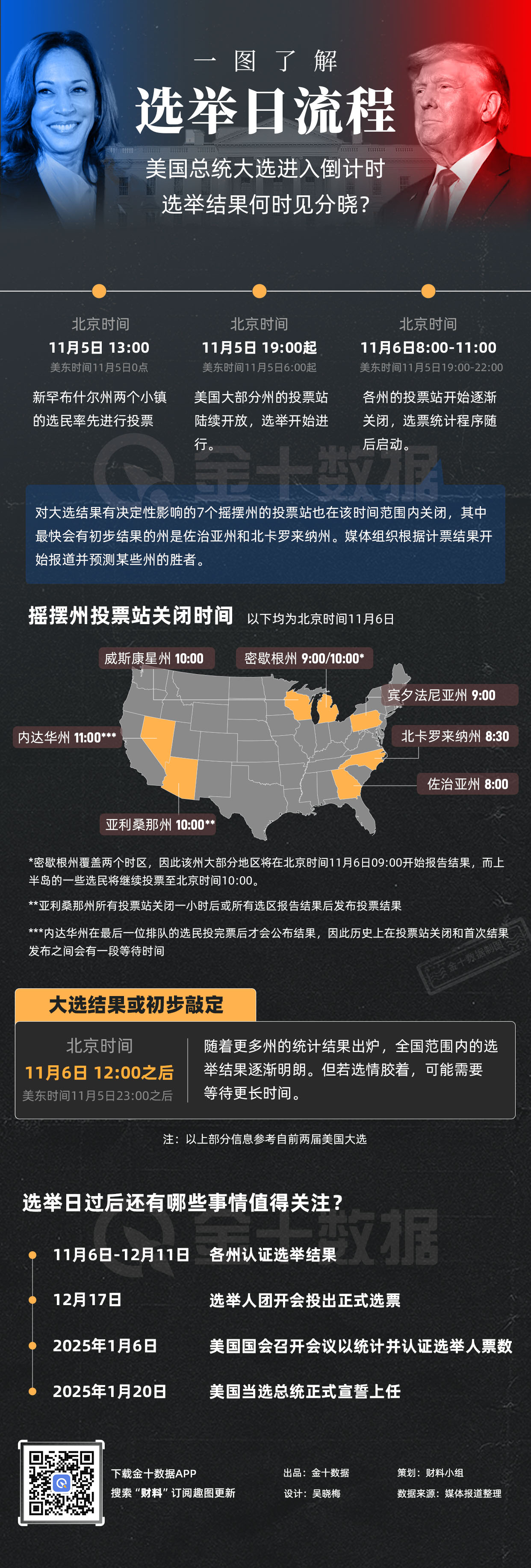 今年,两种情况都有可能发生,取决于竞选的激烈程度。如果双方在少数几个州只差数千张选票,我们可能会经历类似2020年的漫长等待。但若其中一位候选人明显超出当前民调(今年的民调显示,这是多年来最为接近的一次竞选),结果可能会更早揭晓。在那之前,财经网站Forexlive分析师Justin Low指出,大选的第一次出口民调将在北京时间6日07:00结束,最终出口民调将在北京时间6日14:00结束,届时我们可以关注出口民调来提前了解美国大选结果。