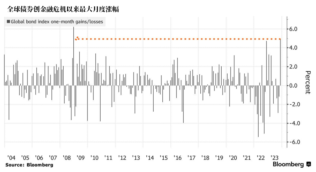 彭博全球主权债务和企业债务指数11月份的回报率达到4.9%,有望创下自2008年12月飙升6.2%以来的最大月度涨幅,当时正值经济衰退最严重的时期。