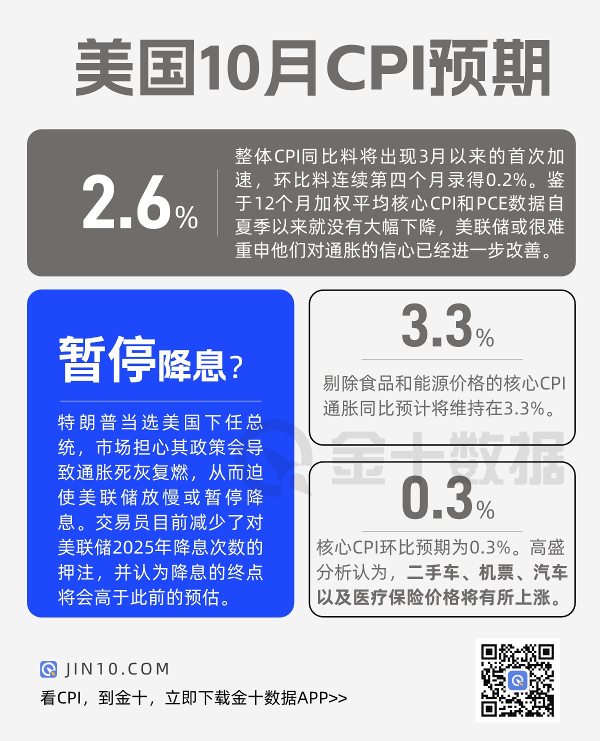 从经济学家的预测来看,本周的CPI通胀数据暂时不会让投资者改变对利率的预期,但担忧依然存在。经济学家预计,10月整体CPI同比料将从此前的2.4%上升至2.6%,环比将录得0.2%,与前值维持一致;核心通胀同比料将录得3.3%,环比料将录得0.3%。与此同时,市场普遍估计,10月份PPI指数(不包括住房)预计将上涨0.2%,高于上月的0.0%;同比预计增长2.3%,高于此前的1.8%。