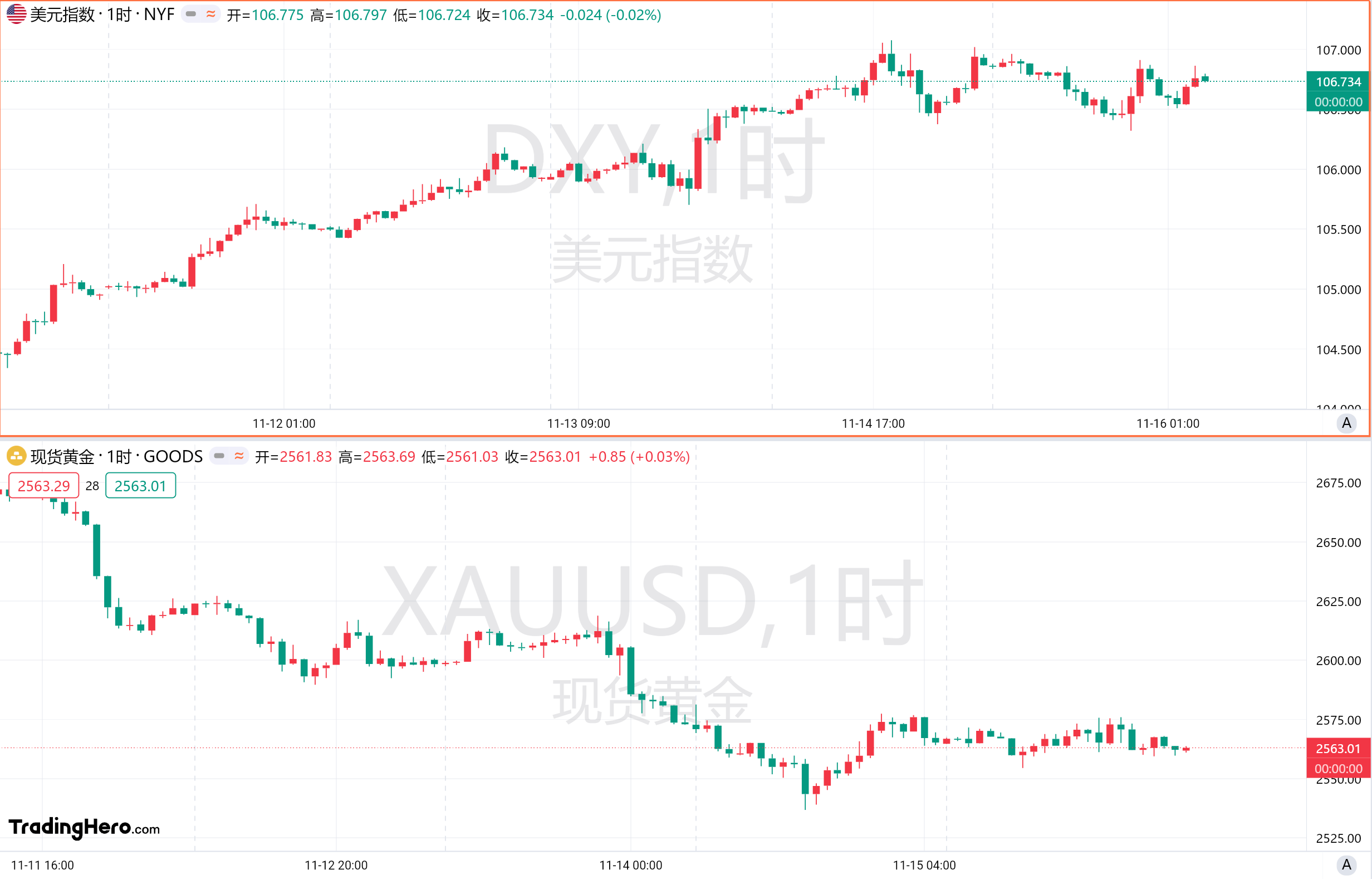美元指数本周整体走高,周四盘中站上107关口,为2023年10月以来的新高,截至周四连续第五个交易日收高,主要得益于“特朗普交易”浪潮的持续以及鲍威尔的鹰派表态。周五美指稍微下跌,收于106.734。