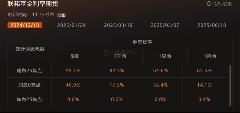 鲍威尔讲话后,交易员重新定价12月降息预期,降息概率有所削减。FEDWATCH显示,美联储12月降息25个基点的预期为59.1%,年底利率可能降至4.5%。