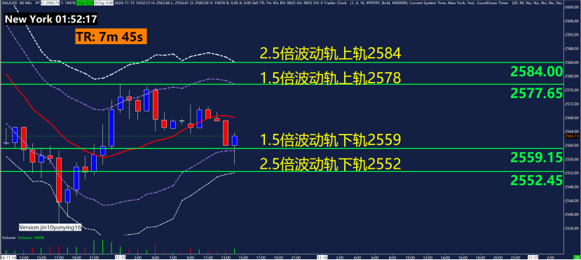 1小时黄金波动轨指标关键点位2552、2559、2578、2584。黄金波动轨主要用在震荡行情,运用波动轨中轨(红色线)判断是趋势还是震荡行情,中轨稍稍水平,先看做震荡行情。