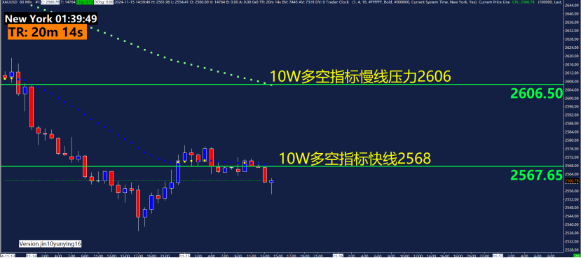 1小时10W多空指标快线压力2568,慢线压力2606。10W多空指标主要用作趋势判断,运用快慢线颜色来判断趋势。4小时空头格局,1小时震荡稍稍偏空,短线按照震荡空头格局观察。在1H级别震荡空头情况下,关注快线压力2568的附近博弈机会以及慢线压力2606附近博弈空机会。