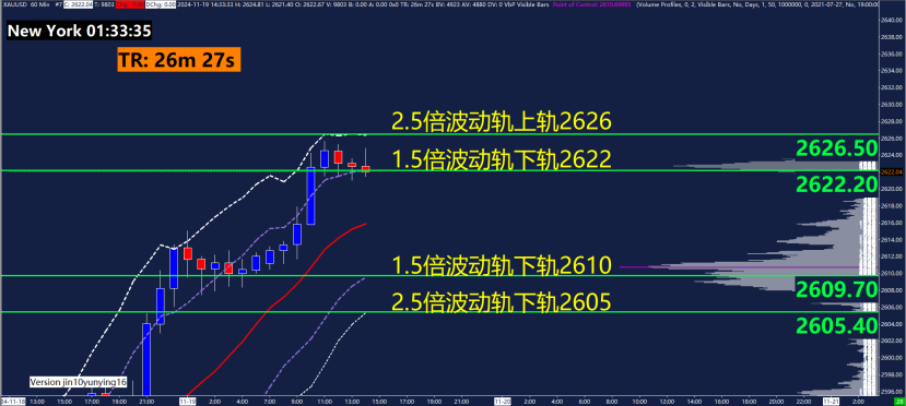 1小时黄金波动轨指标关键点位2605、2610、2622、2626。黄金波动轨主要用在震荡行情,运用波动轨中轨(红色线)判断是趋势还是震荡行情,中轨稍稍朝上,先看做震荡偏多行情。
