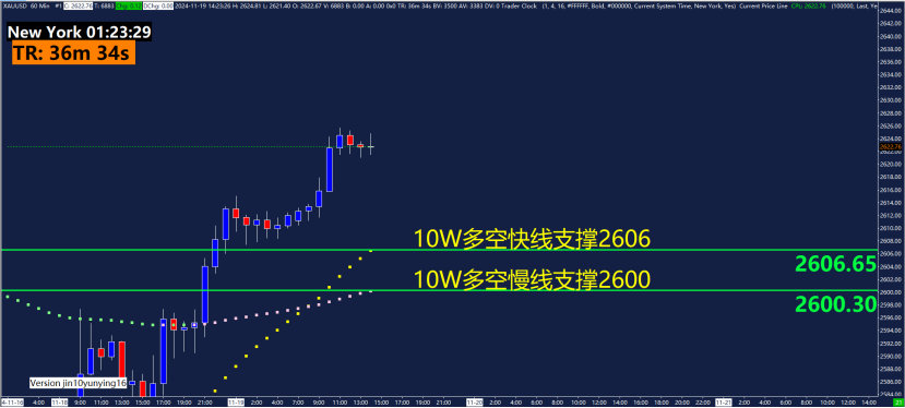 1小时10W多空指标快线2600,慢线压力2606。10W多空指标主要用作趋势判断,运用快慢线颜色来判断趋势。4小时震荡格局,1小时多头,短线按照震荡偏多格局观察。在1H级别震荡偏多情况下,关注快线支撑2606的附近博弈多的机会。