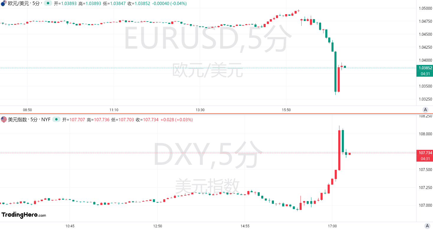 周五欧盘,欧元兑美元一度大跌1%,失守1.04关口,现有所回升;美元指数则一度冲上108关口上方。