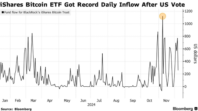 据外媒汇编的数据显示,自11月5日选举日以来,来自贝莱德公司和富达投资等发行商的十几个基金吸引了约99亿美元的净流入,帮助该一领域的总资产增至约1130亿美元。