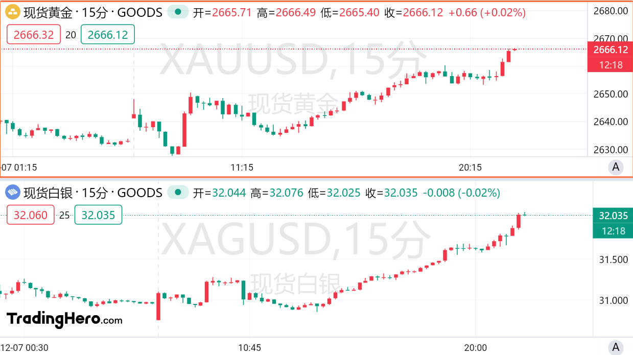 截至发稿,现货黄金涨超1%,站上2660美元/盎司。现货白银跟随黄金走高,日内涨幅扩大至3.5%,升破32美元/盎司。