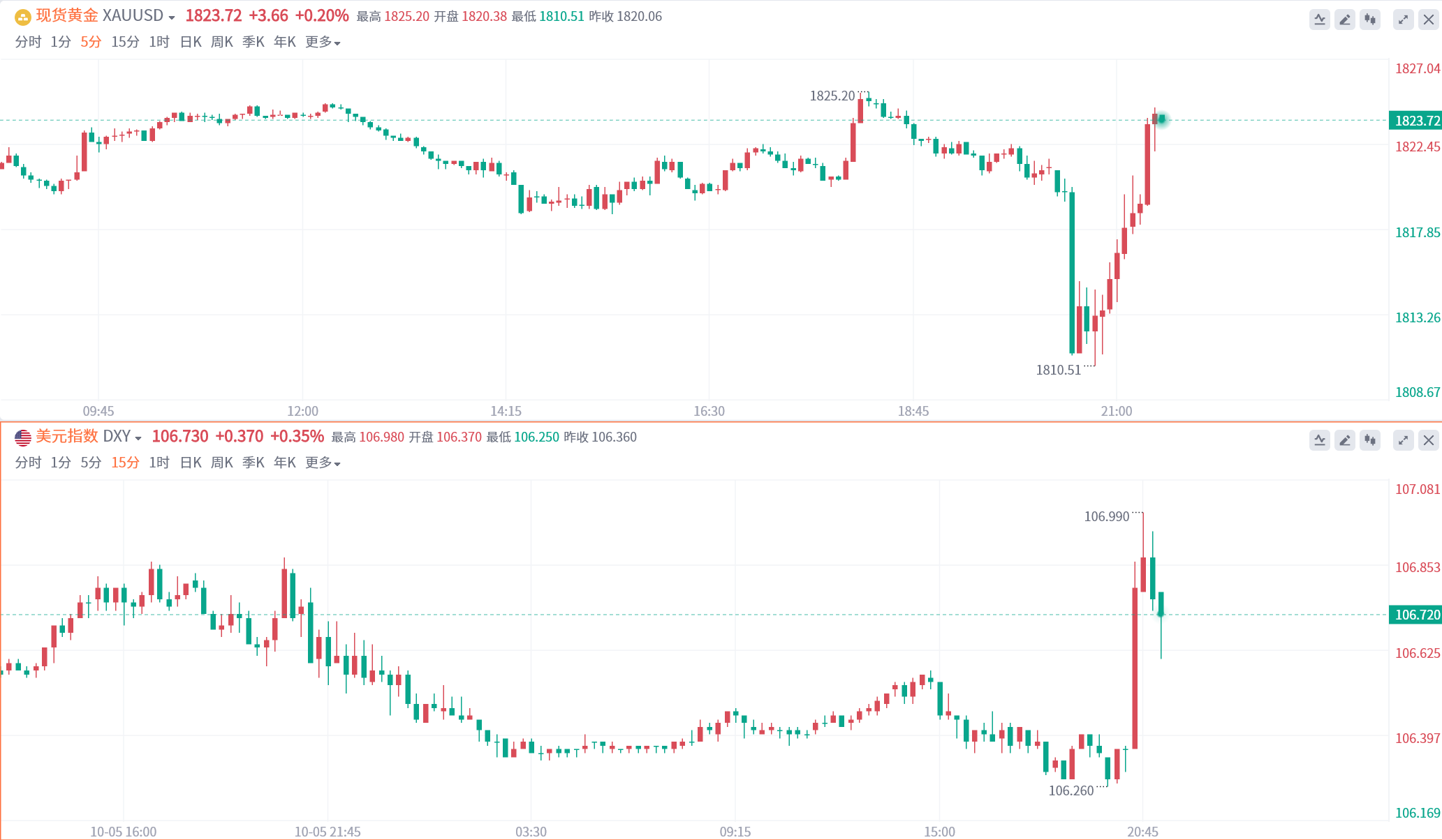 COMEX最活跃黄金期货合约北京时间10月6日20:30一分钟内买卖盘面瞬间成交5351手,交易合约总价值9.71亿美元;