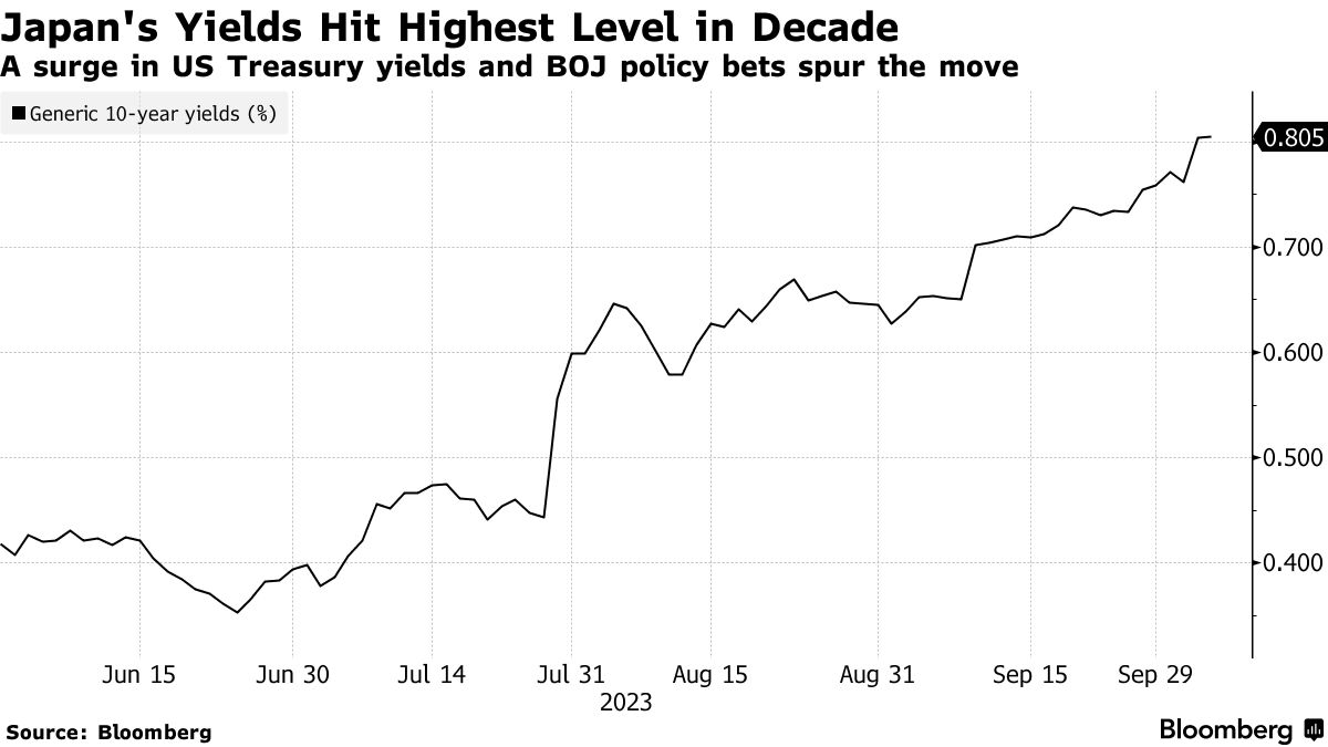 目前,日元兑美元正运行在149附近,接近150的关键心理关口,距离30多年来的最低水平不远。与此同时,日本国债承受巨大卖压,因为日本国内通胀和美债收益率飙升促使交易员押注日本央行会尽早转变政策。 尽管日本央行已经采取了额外措施来减缓这一趋势,即增加债券购买,但长期日本国债收益率本周仍触及10年来的最高水平。