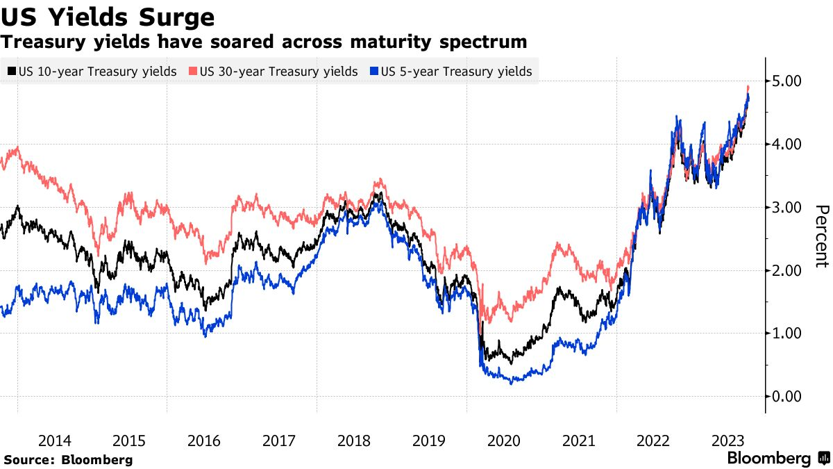 上周五公布非农就业数据后,10年期美国国债收益率一度攀升至4.89%,创下2007年全球金融危机爆发前的最高水平,比今年年初高出约1个百分点。