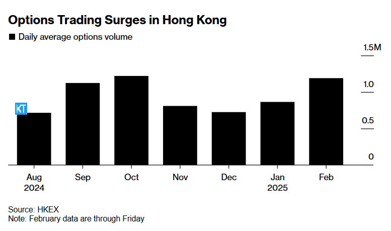 根据香港交易所(HKEX)的数据,自农历新年恢复交易以来,平均每天有近120万份看跌和看涨期权易手,为去年10月以来最高水平。随着科技公司和电动汽车制造商股价飙升,投资者加大了对这些板块的押注。