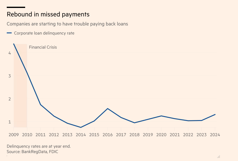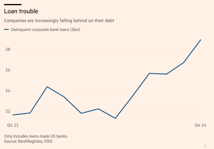 根据BankRegData整理的最新银行监管数据,截至2024年底,美国企业借款人逾期超过一个月的银行债务超过280亿美元,在去年最后三个月增加了22亿美元,较上年同期增加了54亿美元。这一数据并未包括来自直接贷款机构和私人信贷基金的贷款,而这些渠道在企业贷款中的占比正日益扩大。