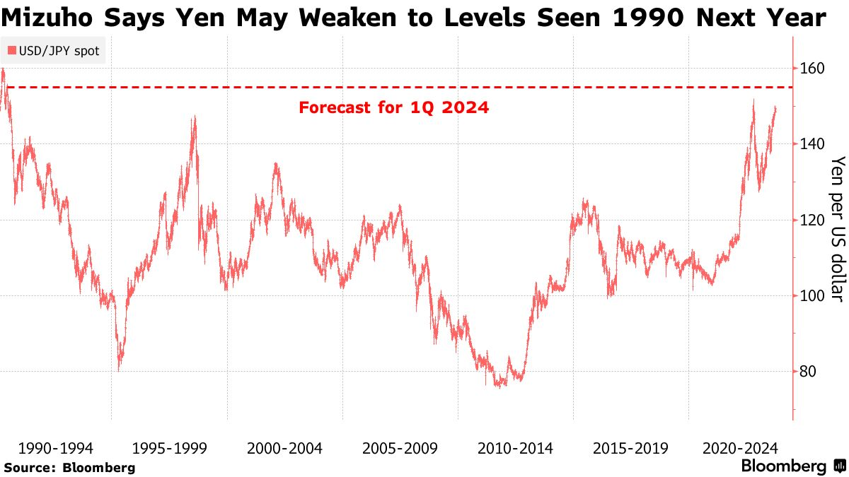 瑞穗并不是唯一这样认为的公司。高盛集团策略师8月份曾说,由于日本政策制定者仍持温和态度,日元将在明年年初跌至1美元兑155日元。美国银行证券也预计,日元兑美元汇率将在2024年上半年触底,跌至1美元兑155日元。