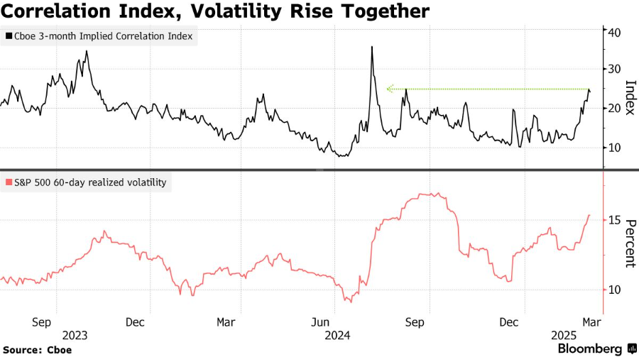 像特朗普的关税这样的宏观风险往往会使股票更同步地波动。上周,衡量股票相关性的指数触及自去年8月初日元套利交易逆转扰乱市场以来的最高水平,此前该指数在进入2025年后一直徘徊在历史低位附近。