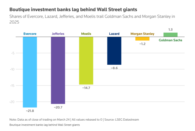 今年以来,Evercore(EVR.N)的股价已下跌约22%,杰富瑞金融集团(JEF.N)今年迄今下跌了21%,而摩根大通的股价上涨了3.5%,高盛的股价上涨了1.3%。