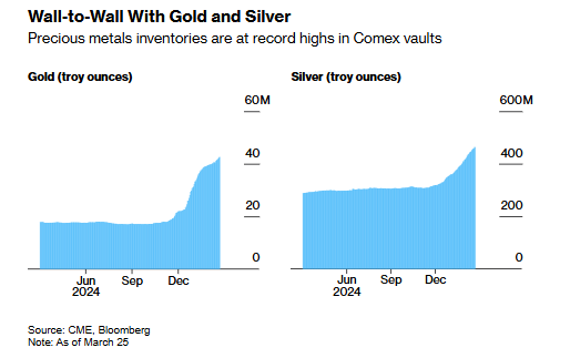 纽约商品交易所的黄金库存继1月份增长43%之后,上个月又激增了25%。截至周二,纽约商品交易所的黄金库存达到创纪录的4260万盎司,几乎是2024年底库存的两倍。