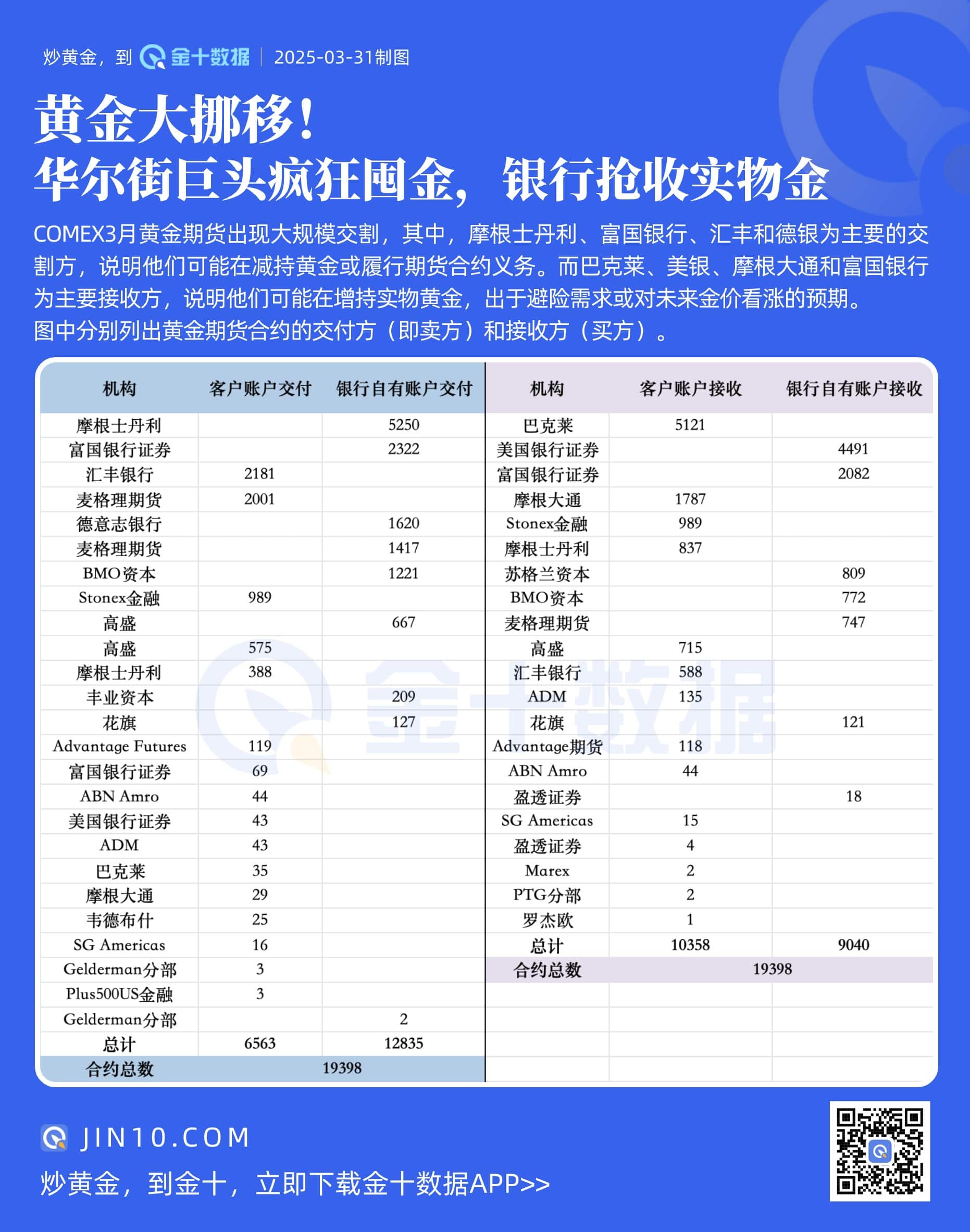 从下图来看,摩根士丹利、富国银行、汇丰和德银为主要的交割方,说明他们可能在减持黄金或履行期货合约义务。而巴克莱、美银、摩根大通和富国银行为主要接收方,说明他们可能在增持实物黄金,出于避险需求或对未来金价看涨的预期。
