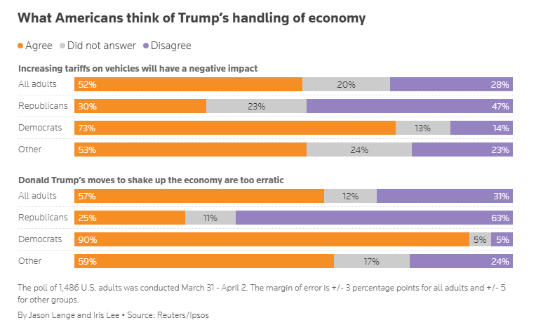 约一半(52%)的受访者认同这样一种说法,即特朗普周三公布的新关税举措中,提高对汽车和汽车零部件的关税将伤害到他们身边的人,大约同样比例的人表示,提高关税弊大于利。约三分之一的美国人(主要来自特朗普所在的共和党)表示,他们不同意关税会造成伤害的说法。