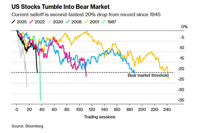 标普500指数并非唯一面临熊市的主要基准指数,以科技股为主的纳斯达克100指数(NDX)已经进入熊市。全球各地的股票指数也经历了类似幅度的惊人快速下跌,包括日本的日经225指数。油价也随着大宗商品价格一同暴跌。