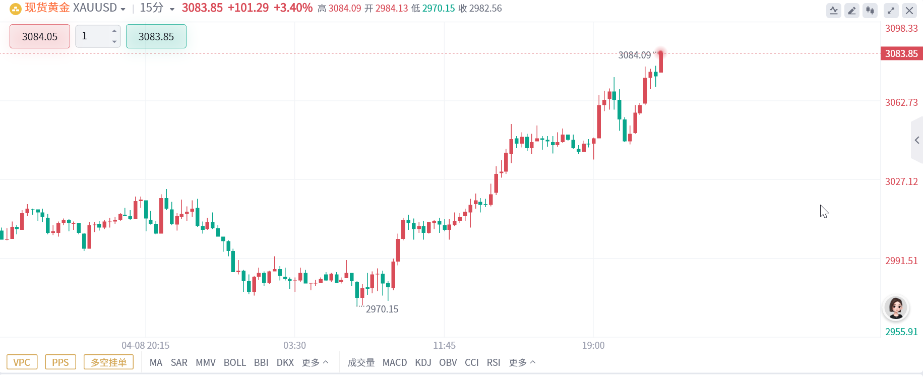 在避险资金的提振下,现货黄金持续走高,站上3080美元/盎司,日内涨超3%,同时美元走弱以及美联储降息可能性上升为金价提供了支撑。