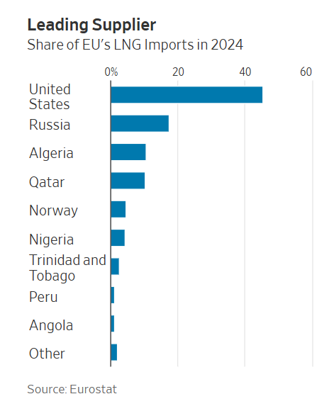 欧盟现在购买的美国石油和天然气已经远远超过俄乌冲突之前的水平。根据欧盟官方统计数据,2024年,美国供应了欧盟约16%的石油进口量和45%的LNG进口量,成为这些进口的最大来源地。