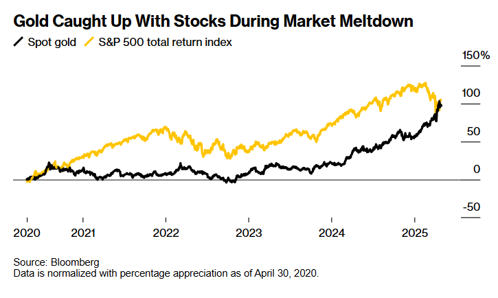 当黄金被排除在关税范围之外时,这一交易最终戛然而止。然而,在全球市场大幅下跌导致黄金价格短暂下跌之后,随着黄金作为避险资产久经考验的属性凸显出来,其价格迅速大幅上涨。本月早些时候,黄金价格最高达到每盎司略高于3500美元,即使在最近几个交易日有所下跌之后,黄金现在也可以与标普500指数相媲美,成为过去五年中全球表现最好的主要资产之一。
